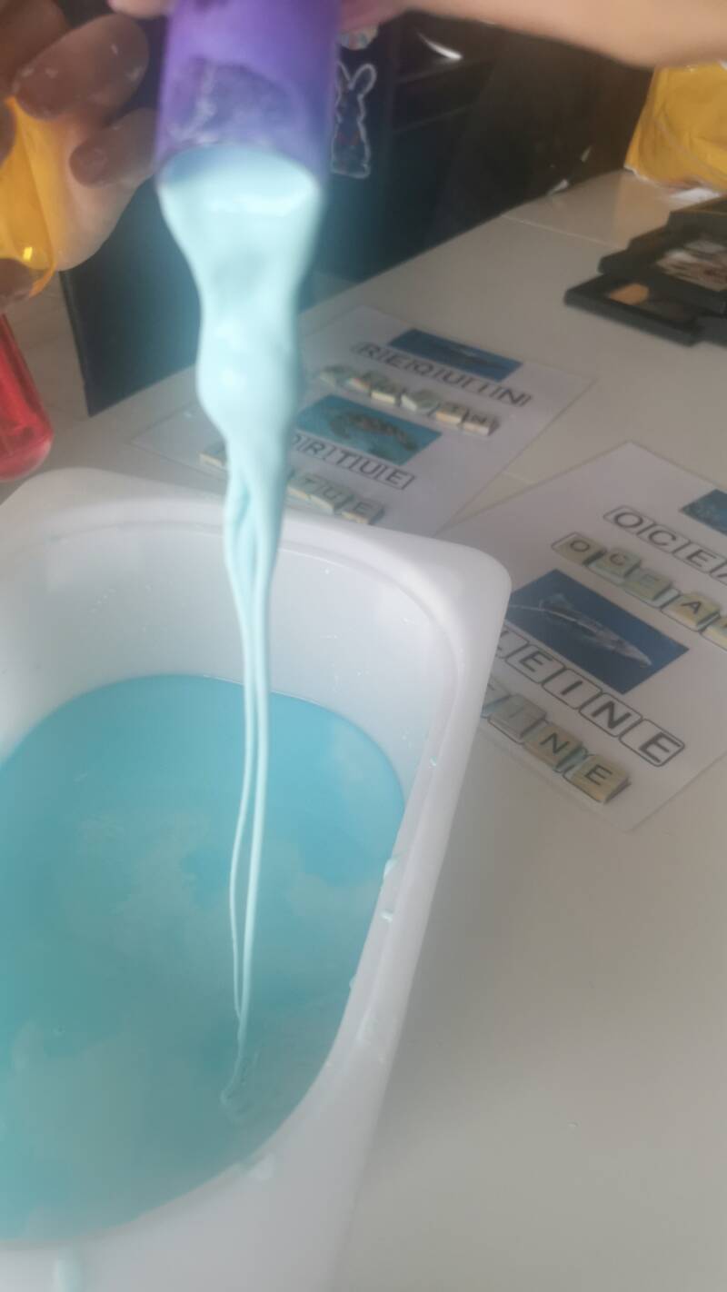 - transvasement avec une cuillère cette fois le sable est remplacé par du bicarbonate de soude rose. Il sera utilisé avec du vinaigre