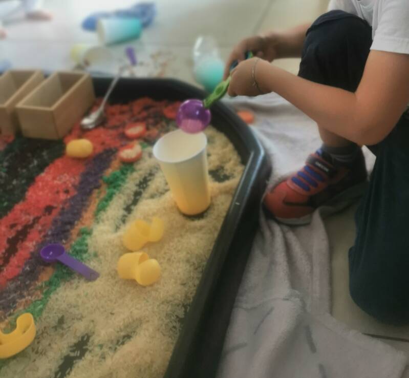 Pour coloré du riz : la veille de l'activité mettre du riz dans des sachets plastique et ajouter la peinture de la couleur souhaitée bien mélanger puis placer sur du papier cuisson pour que le riz sèche.